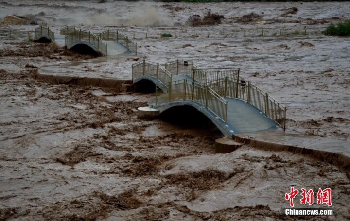 山西省と陝西省の境にある黄河壺口瀑布では22 日、両省一帯に降った豪雨の影響で、今年に入り最大規模の増水となり、1秒あたり流量が5000立方メートルを上回った。