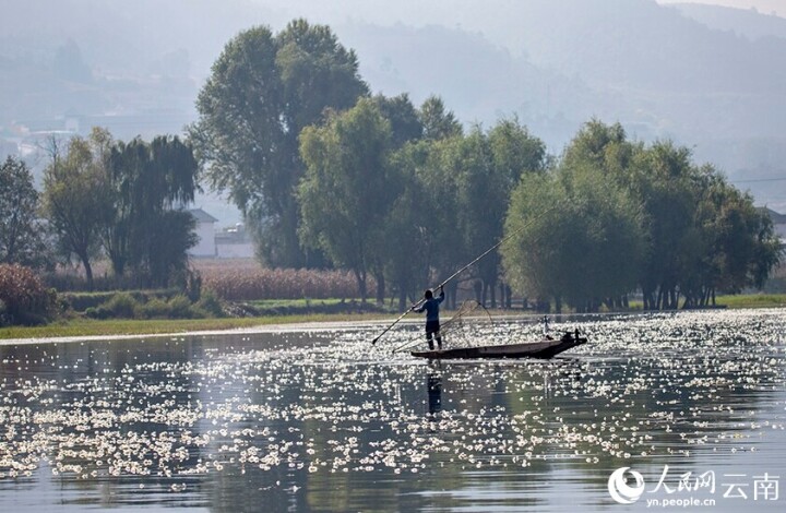海菜花の咲く湖面と漁をする人々が雲南省の剣湖の10月の風物詩となっている。