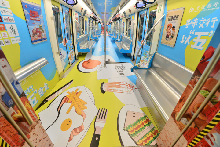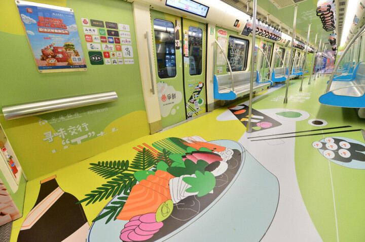 四川省成都市を走る地下鉄1号線の車内はグルメのイラストで埋め尽くされていた。