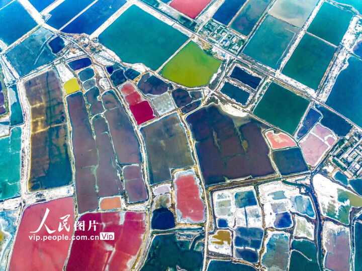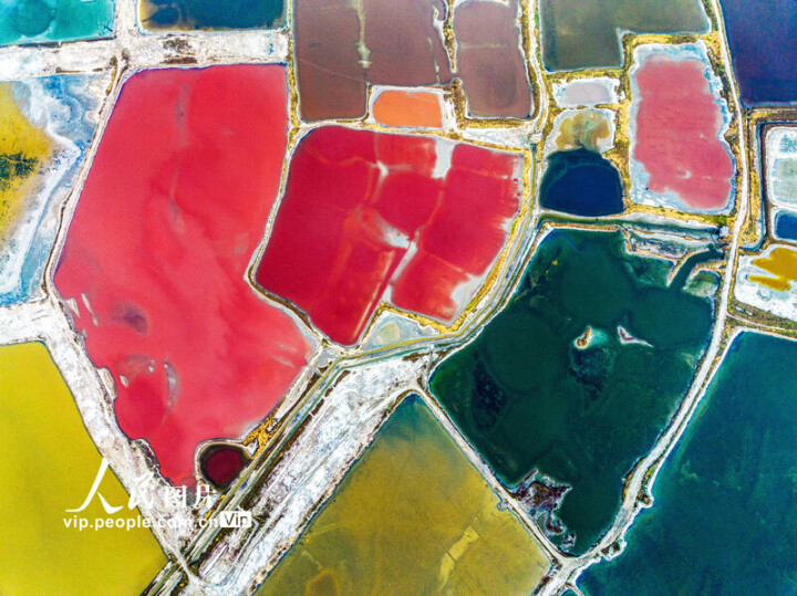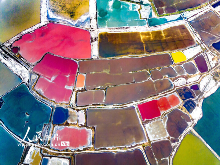 秋が訪れ、気温が低下するのに伴い、山西省運城市にある塩湖が色とりどりに染まっている。上空から眺めると、まるでパレットのようなカラフルな風景が広がっている。