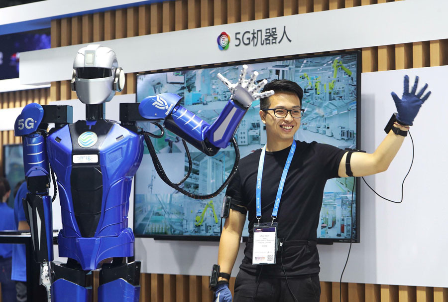 中国の5G端末利用者数が5億2000万人に達した。写真は操作する人間の動作とシンクロする5Gロボット。