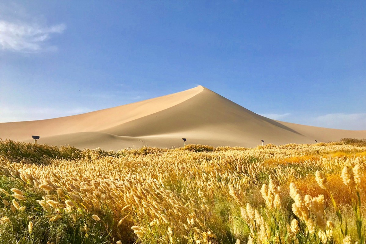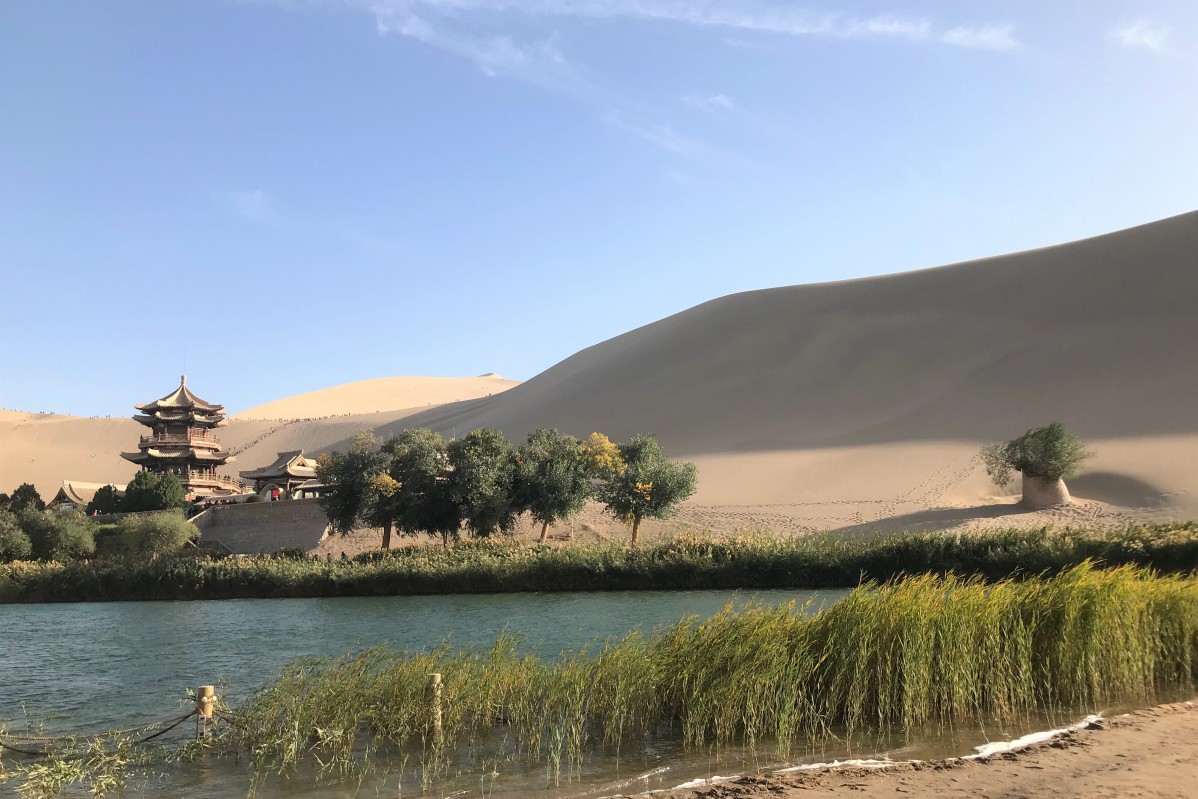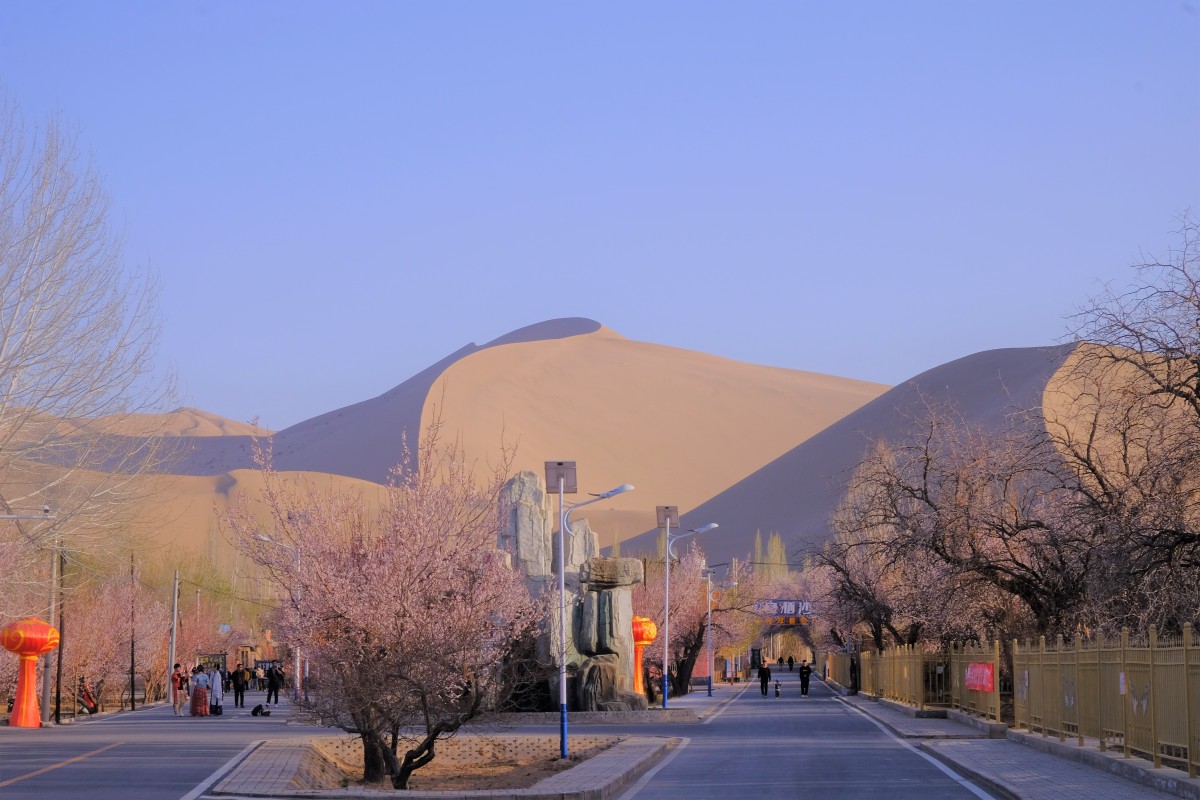 甘粛省敦煌市鳴沙山のふもとに広がる約67ヘクタールの李広アンズの花が3月末、満開を迎えた。