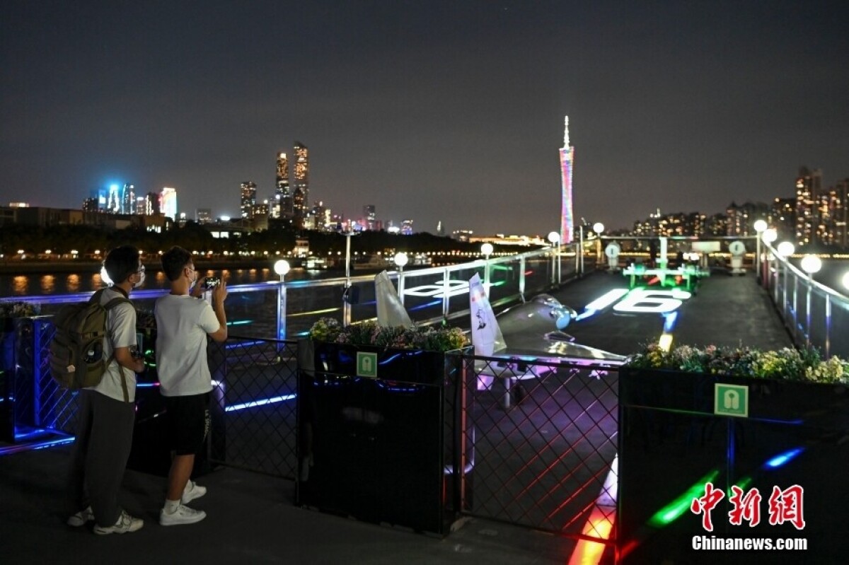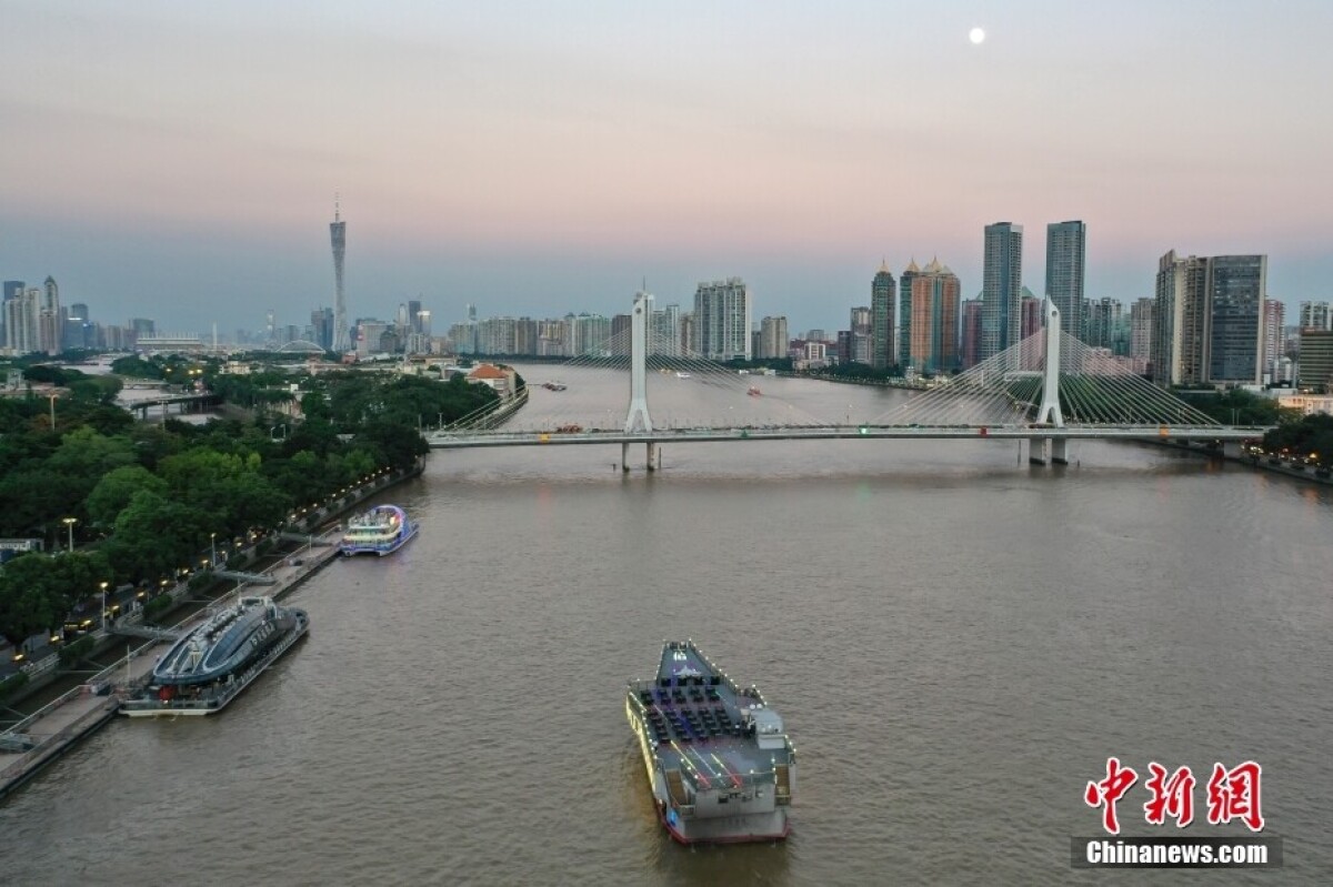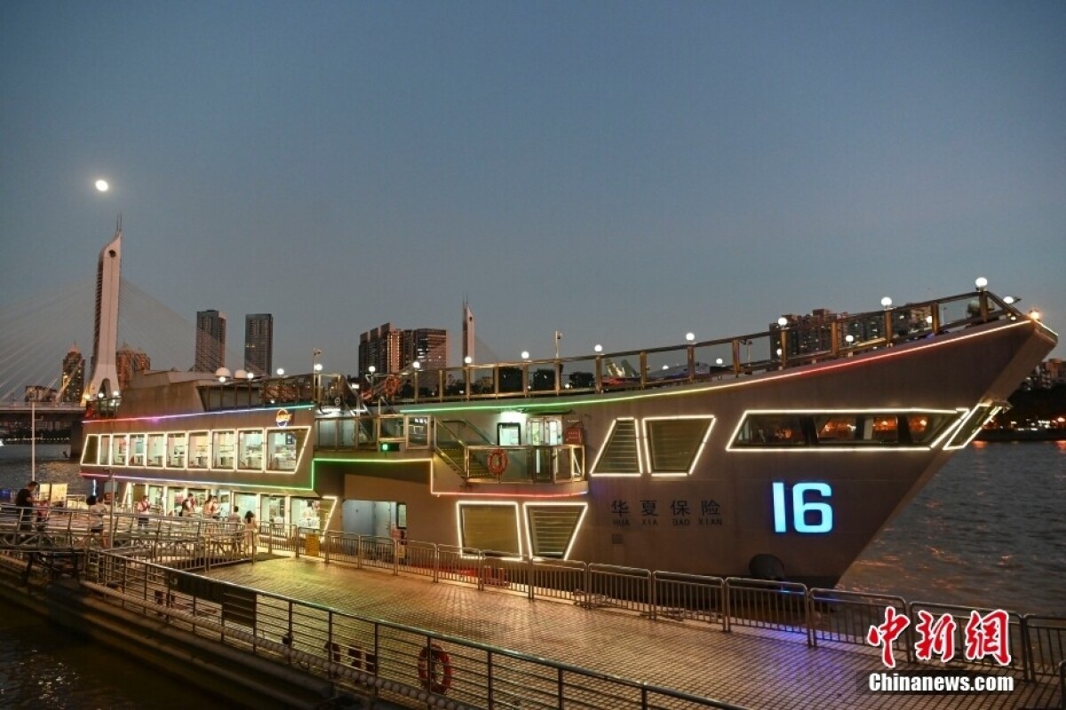 広東省広州市で「軍事文化博物館」をテーマにした遊覧船「藍海豚16号」が珠江の河川港に停泊し、多くの観光客が乗り込んでいた。