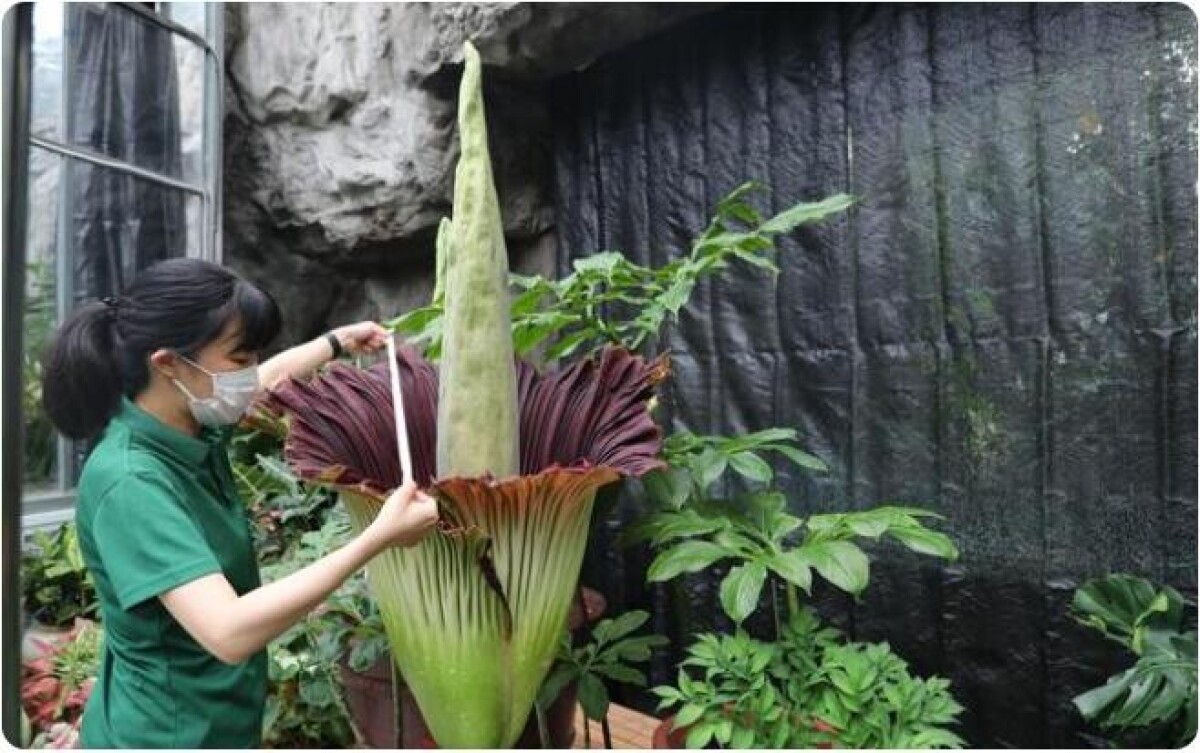 中国国家植物園の展覧温室内で栽培されているショクダイオオコンニャクが19日の時点で花を咲かせている。