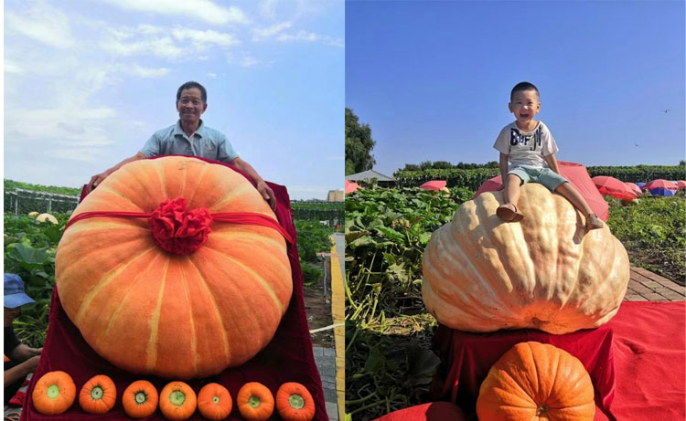 第21回中国長春国際農業・食品博覧会で展示された500キログラムのカボチャの周りに多くの観光客が集まった。