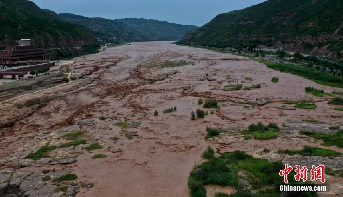 山西省と陝西省の境にある黄河壺口瀑布では22 日、両省一帯に降った豪雨の影響で、今年に入り最大規模の増水となり、1秒あたり流量が5000立方メートルを上回った。