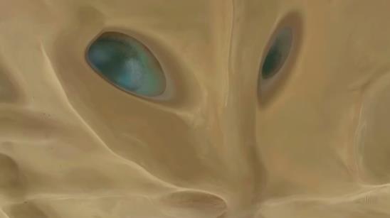 新疆ウイグル自治区クムクリ砂漠で7月、大雨が降って、砂の尾根を挟んで二つの池ができるという珍しく神秘的な景色が出現した。