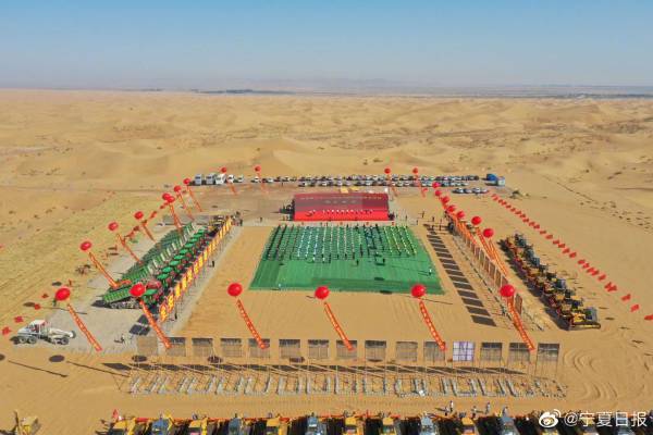 中国最大規模の砂漠太陽光発電拠点建設プロジェクトとなる「トングリ砂漠3ギガワット新エネルギー・太陽光発電複合プロジェクト」の着工式が9日、寧夏回族自治区中衛市で行われた。