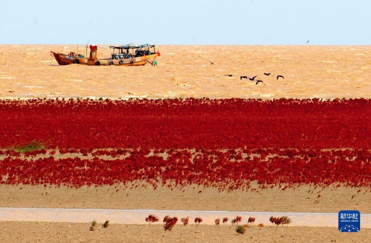 山東省黄河三角州国家級自然保護区では最近、アガサ科マツナ属の植物「Suaeda salsa」が茂り、広い干潟一面に「レッドカーペット」を敷いたような景色が広がっている。