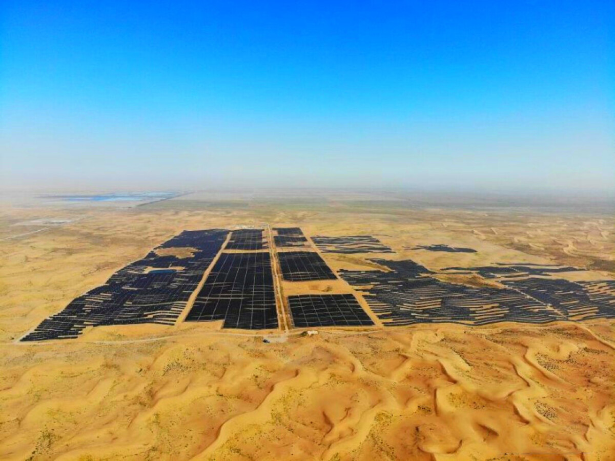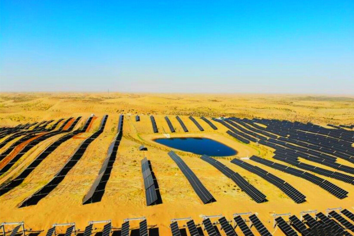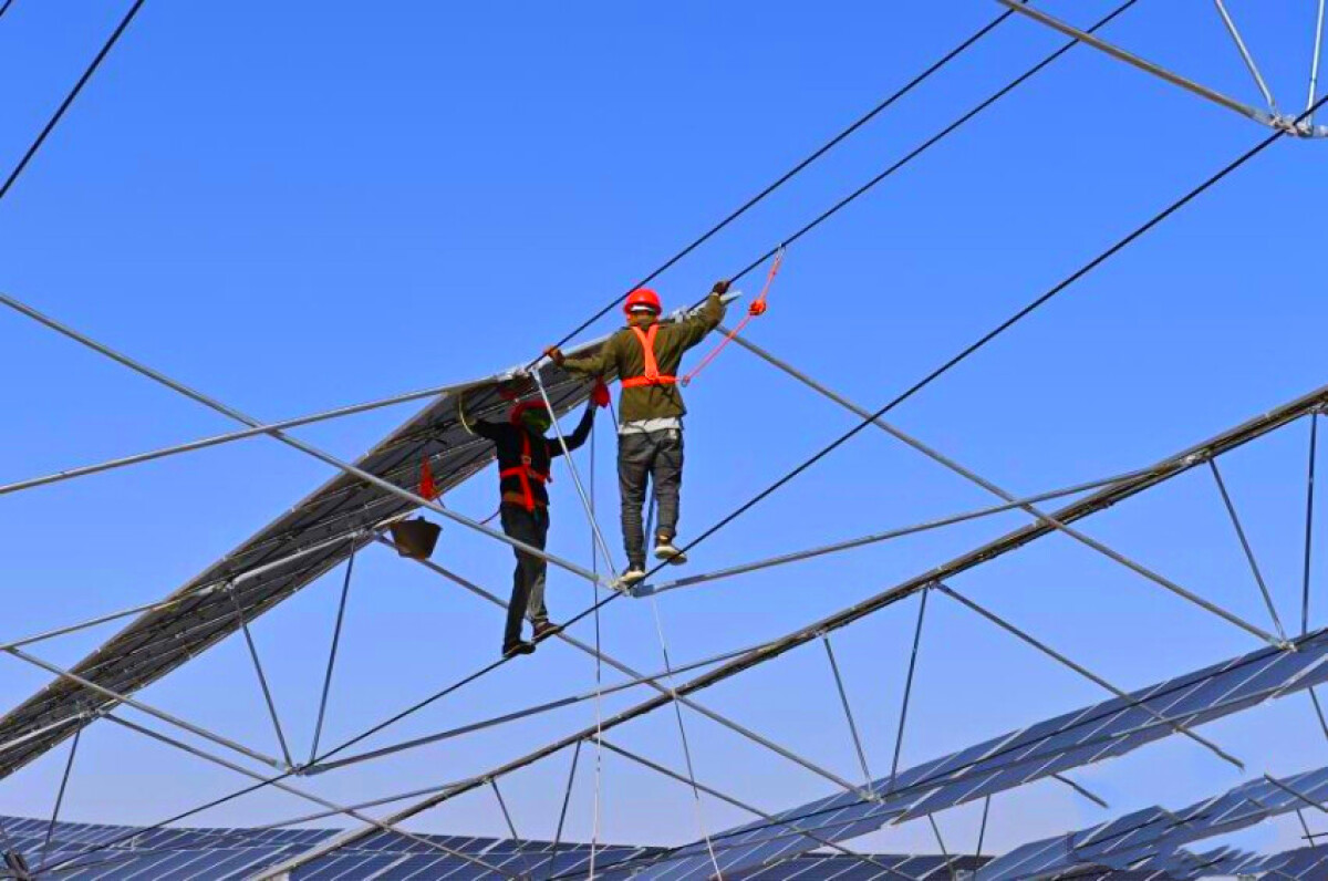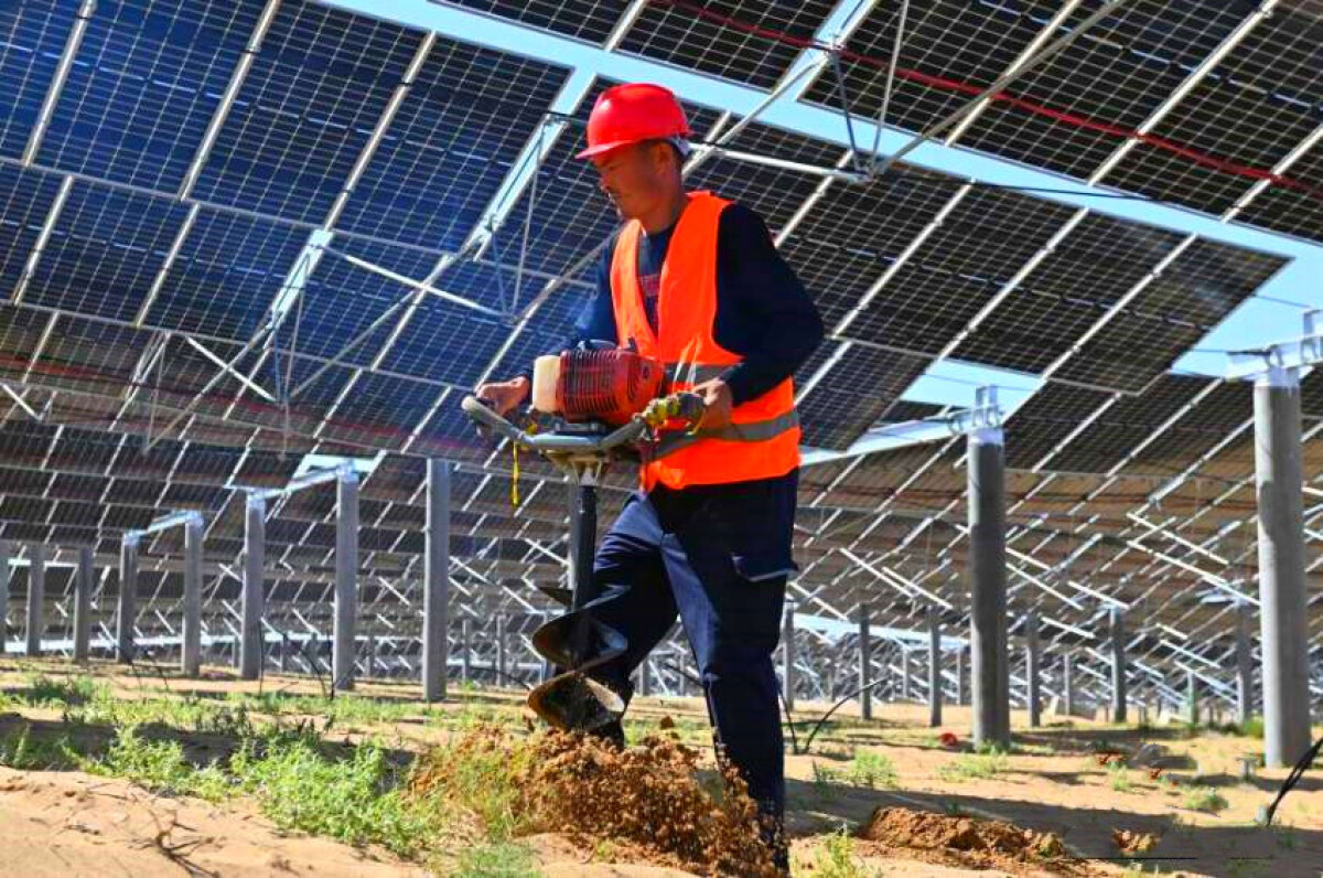甘粛省武威市で、甘粛億恒新エネルギー有限公司による50万キロワット級立体化太陽光発電砂漠対策産業化モデルプロジェクトの現場で、スタッフが植樹作業を進めていた。