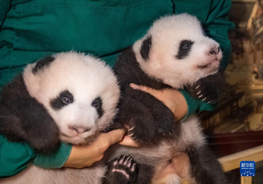 1日、重慶動物園のジャイアントパンダ館では、7月22日に生まれた双子のパンダの赤ちゃんがついに公開され、来場者と初めて対面した。