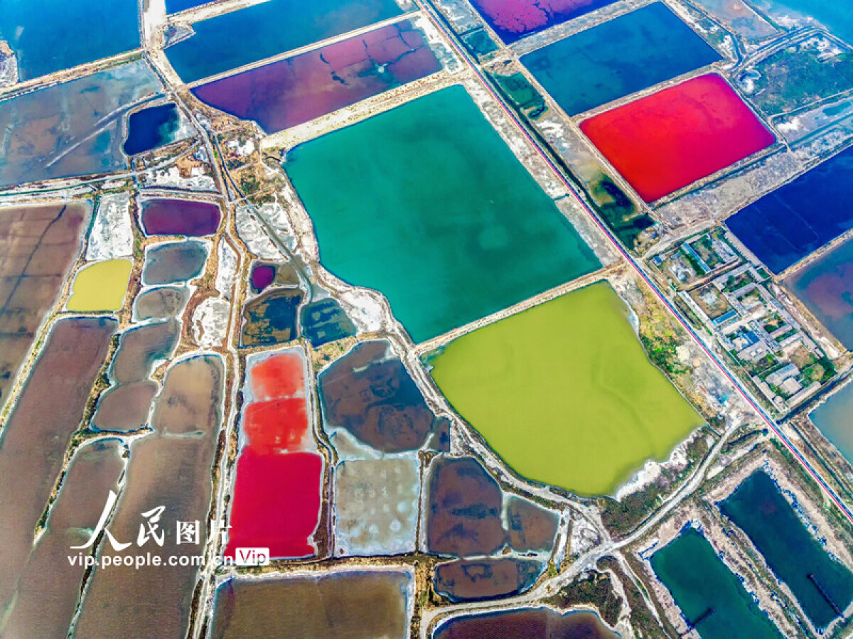 秋が訪れ、気温が低下するのに伴い、山西省運城市にある塩湖が色とりどりに染まっている。